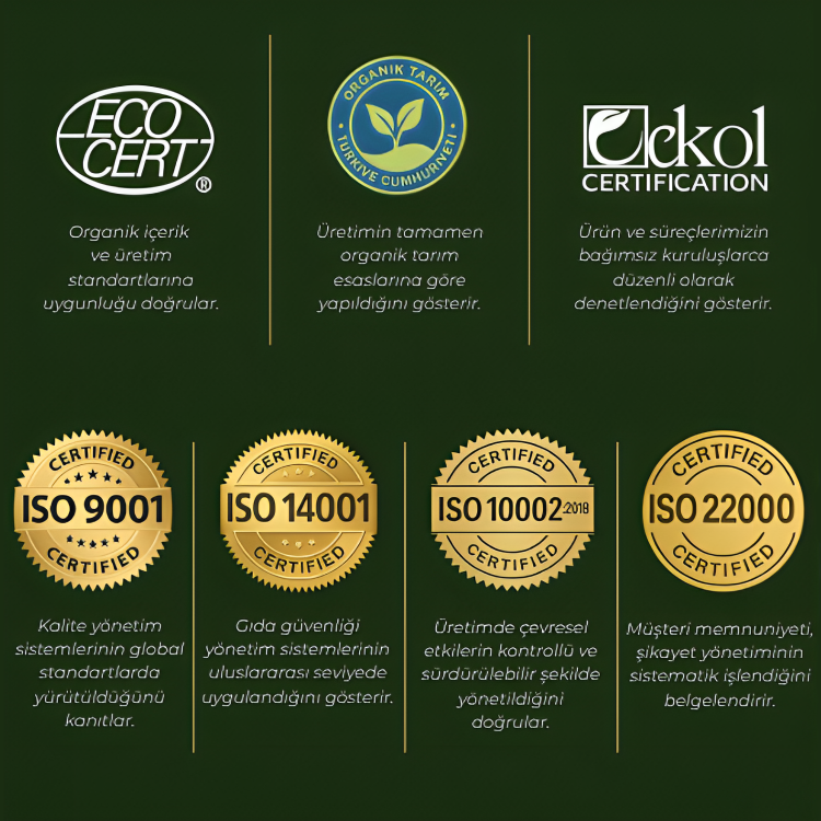 • Organik Sertifikalı Üretim: Tesisimizde el değmeden, düşük asit değerinde, Ecocert sertifikalı şişeleme.